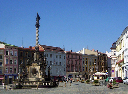 La colonne mariale de la peste, élevée pour remercier la Vierge Marie d’avoir protégé la ville contre la peste, au centre de la Place-Basse (Dolni Namesti), entre 1716 à 1723. La colonne de style baroque est due au sculpteur Filip Sattler, elle est surmontée d’une statue dorée de la Vierge Marie, qui domine un ensemble sculpté orné d’anges, de saints protecteurs et de symboles religieux.