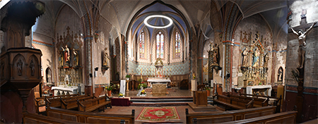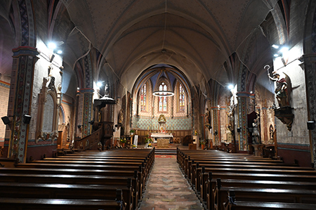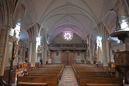 L’intérieur de l’église est composé d’une vaste nef voûtée sur croisée d’ogives soutenue par des arcs doubleaux. Les troisième et quatrième travées sont gothiques, les première et deuxième ont été rajoutées au XlXe siècle, de même que la vaste tribune métallique.