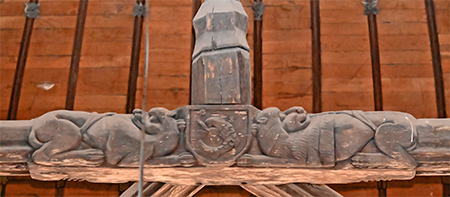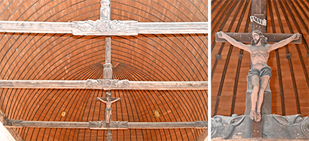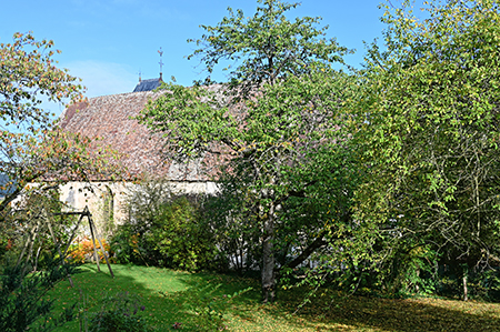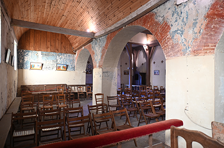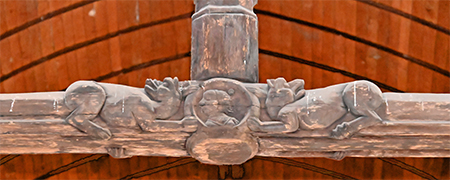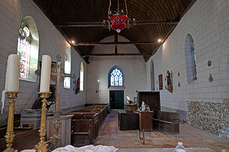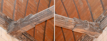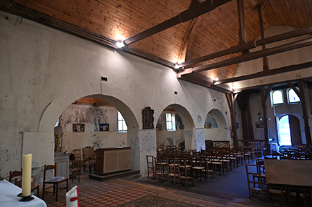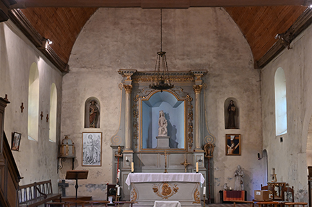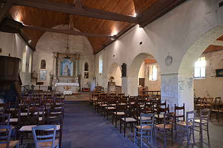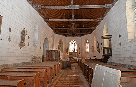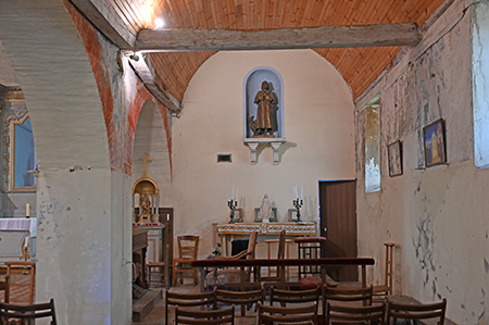 Le toit de tuiles restauré par le Chanoine Bridet est porté par une belle charpente à chevrons dont les entraits (ou tirants) reposent sur les murs, ils sont ornés de têtes de chimères qu’on appelle aussi des « hurlants ». Dans le chœur, l’autel du XIXe siècle rappelle les sculptures médiévales.