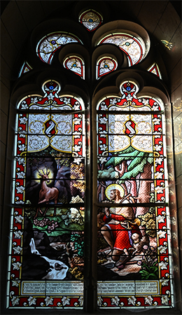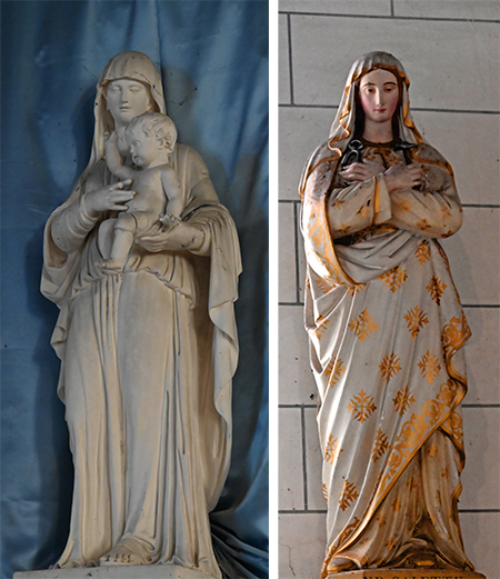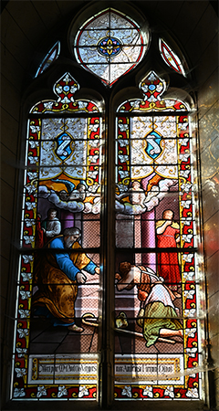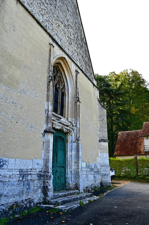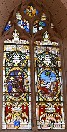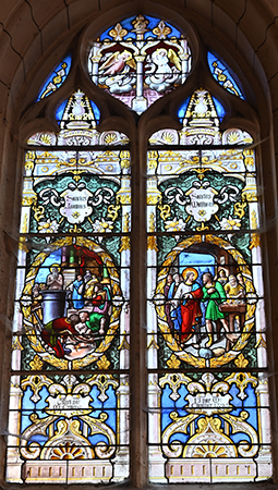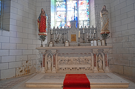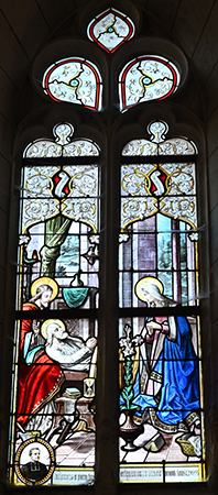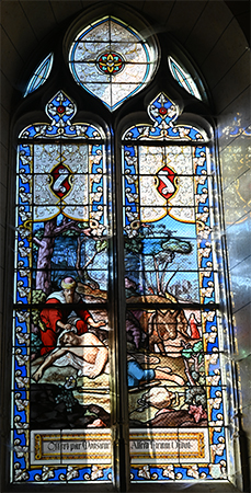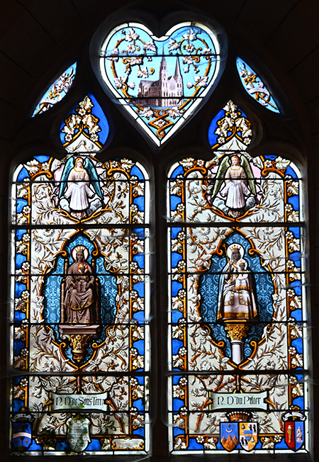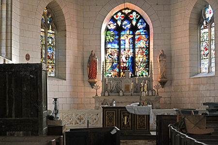Dans la chapelle seigneuriale du nord un vitrail dédié à N-D de Chartres où sont représentés divers rappels de la Cathédrale. On remarquera également une statue de Sainte Marguerite (ou de Sainte Marthe) avec un dragon acéphale, en marbre blanc, sculptée par la Princesse Marie d’Orléans et son Maître Mr de Triquetty qui fut le sculpteur du fronton de la Madeleine à Paris.