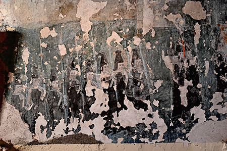 Bien que très endommagée, la fresque permet encore de distinguer la confrérie se dirigeant vers la chapelle avec son « tintinellier », puis les porte-bannières et les porte-croix suivi des frères servants.