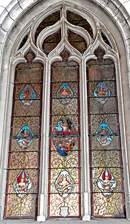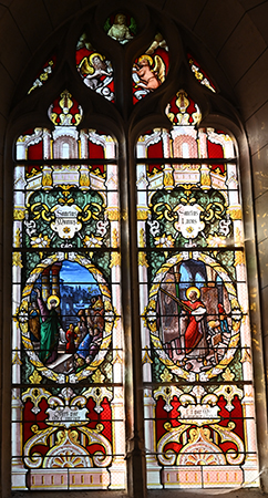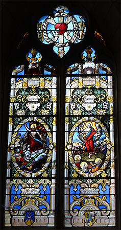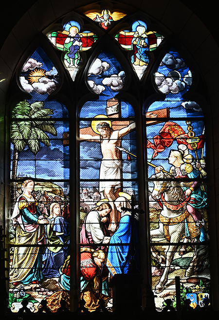 L’ensemble des vitraux ont été offerts dans les années 1850 par les paroissiens, la famille d’Orléans, le comte de Reiseit, Firmin Didot, l’abbé Véron etc. Parmi les plus caractéristiques on peut détailler dans l’abside la « Crucifixion » placé exactement à l’est, ce qui conduit lors des offices de la matinée, à un brillant éclairage de la composition. On remarquera d’ailleurs une rare particularité, c’est la disposition à l’arrière du Golgotha d’une cité largement urbanisée (la Jérusalem terrestre). Dans l’abside également les représentations des quatre Évangélistes.