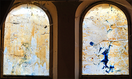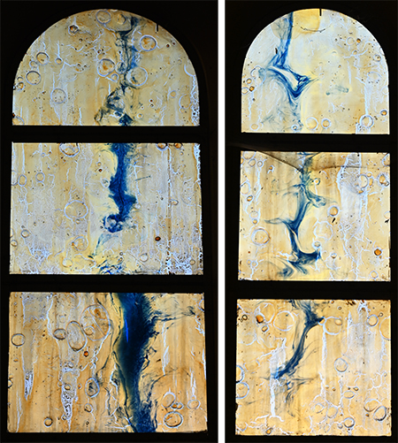 Les vitraux présentent un décor abstrait jaune et bleu avec reliefs