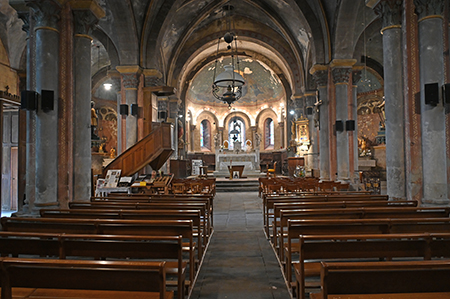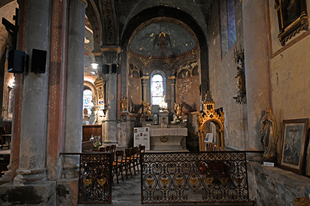 Une abside polygonale à l’intérieur encadrée de 2 absidioles reconstruites après 1865. La voûte romane en cul de four, dans le chœur, et à droite, les absidioles cohabitent avec les voûtes gothique de la nef.